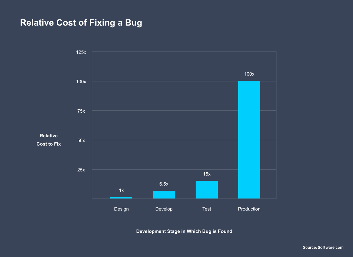 And the cost of code churn changes over time. When it comes to fixing defects or bugs, the cost escalates dramatically as you progress along the software development lifecycle. The cost to fix a bug in production can be 100 times more expensive than to fix it in design.