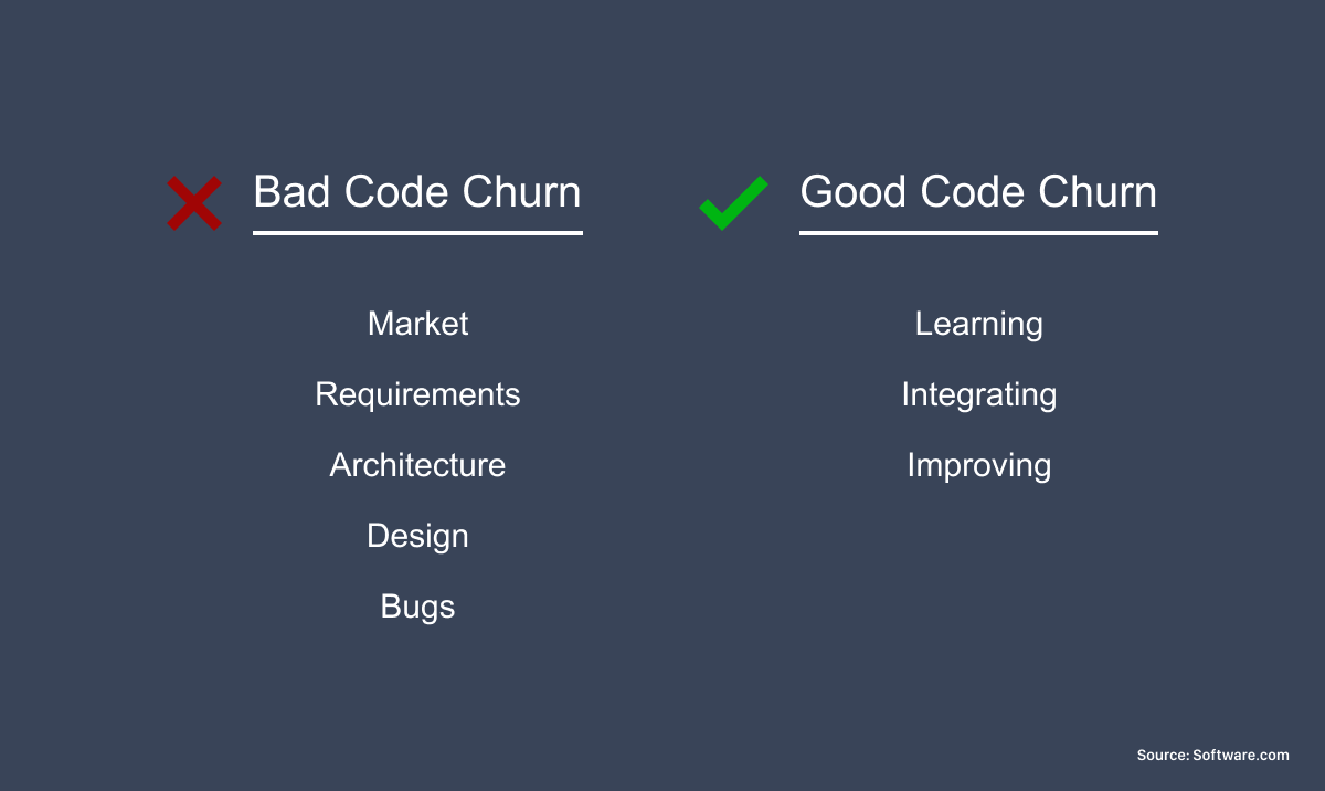 There are certainly bad causes of code churn. There's a change in the market that makes a product obsolete. Product managers often get requirements wrong. We find a critical flaw in architecture or design. Or we find bugs in our code that need to be fixed.