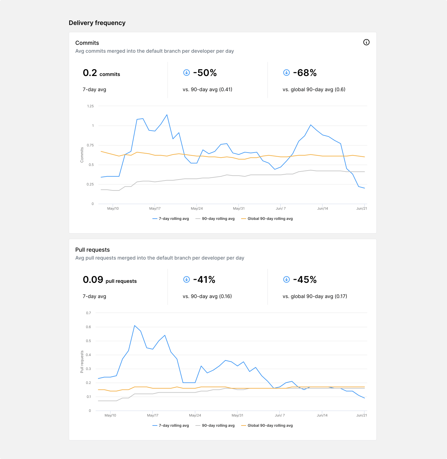 Commit frequency measures the average number of commits merged into the default branch per developer per day. Pull request frequency measures the average number of pull requests merged into the default branch per developer per day.