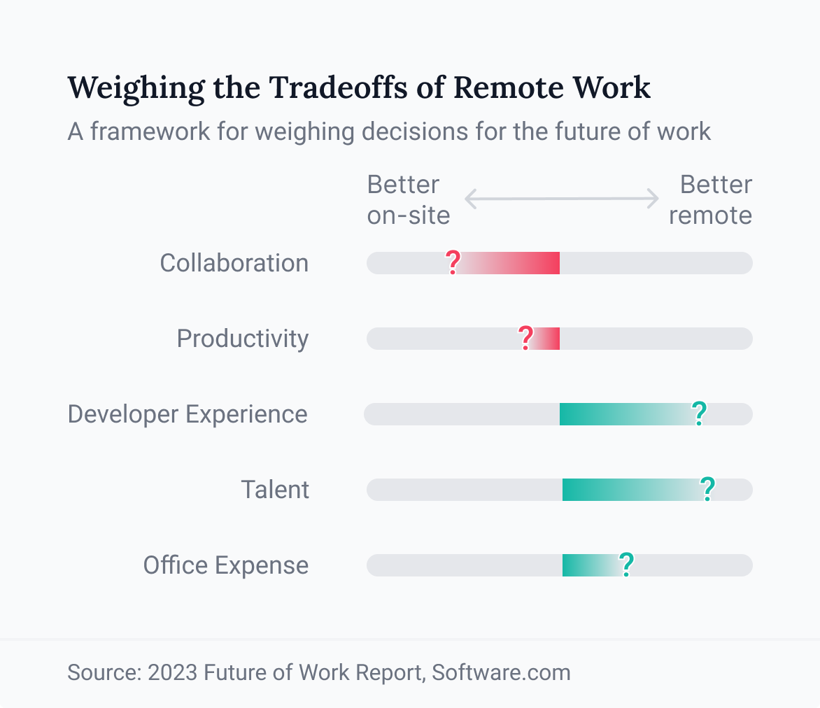 - Experiment with different work models. Instead of applying a one-size-fits-all model, leaders should enable teams to see where they are most productive — while simultaneously weighing the qualitative impacts of work environments on the developer experience, including work-life balance, satisfaction, and retention.