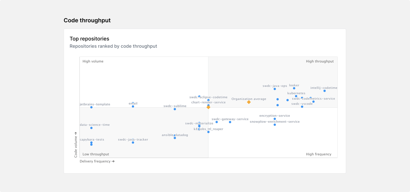 Lastly, we generate a chart of your organization’s code throughput, which compares code volume and delivery frequency by repository.