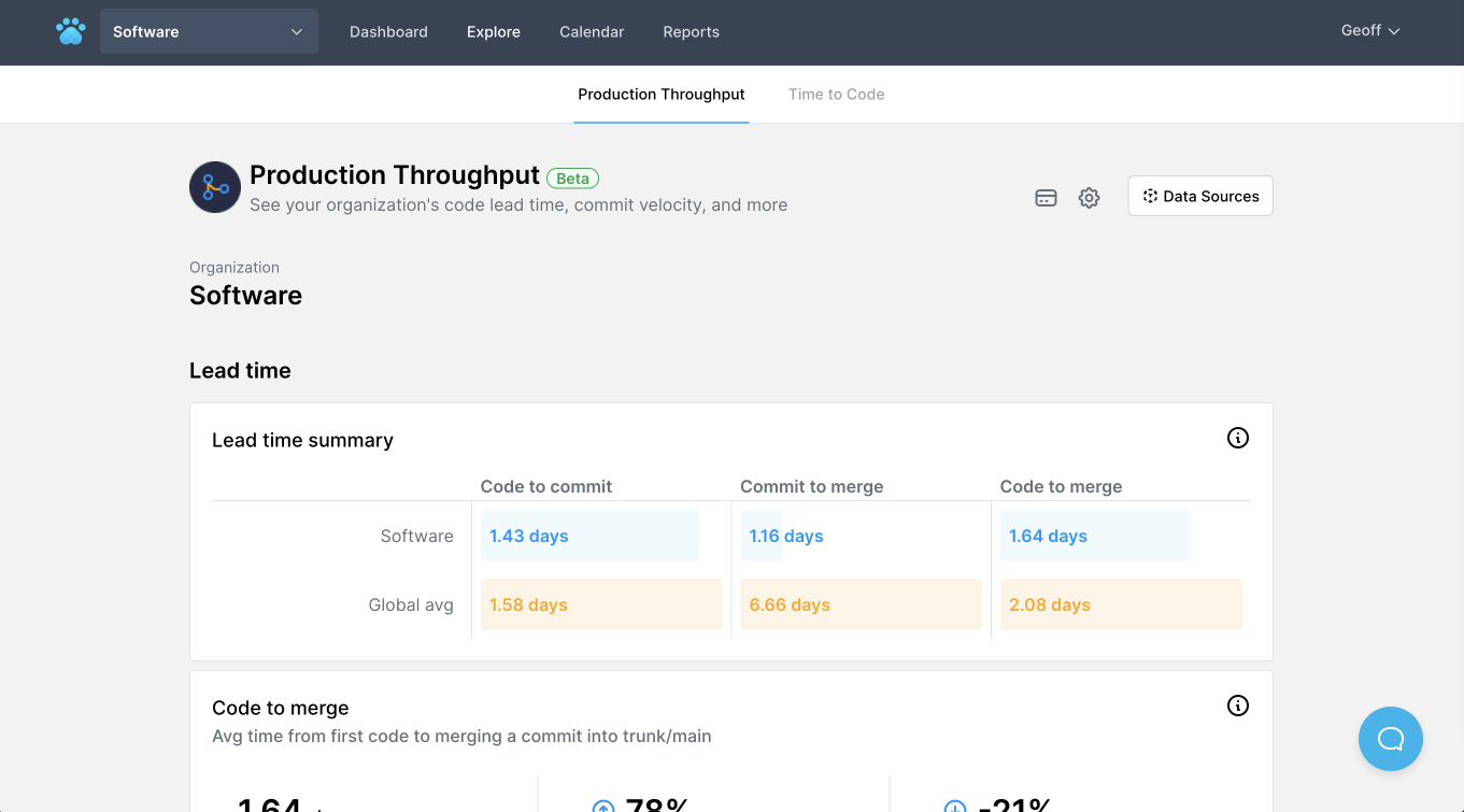 After generating your GitHub report, you’ll unlock access to continuously updating metrics about your organization's DevOps performance. You can learn more about your organization’s lead time, commit activity, and production throughput—refreshed daily in your team’s Production Throughput view.